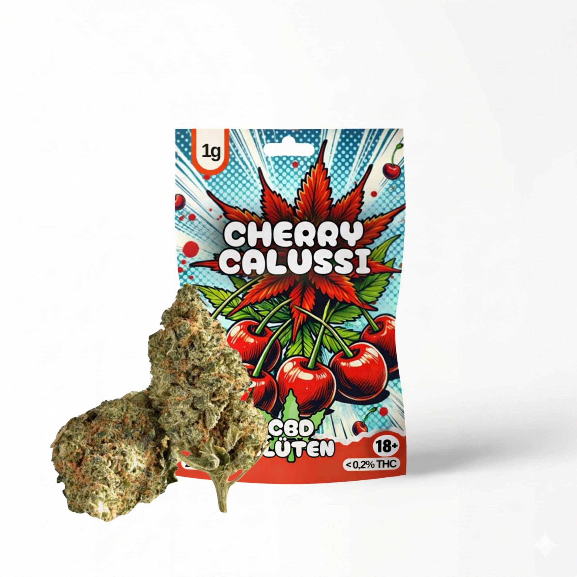 Cherry Calussi CBD Blüten in 1g-Verpackung mit Kirsch-Motiv, davor zwei getrocknete Hanfblüten auf weißem Grund